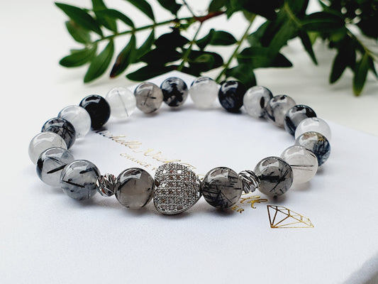 Tourmaline Quartz gemstone bracelet with silver plated zircon heart 8mm bead