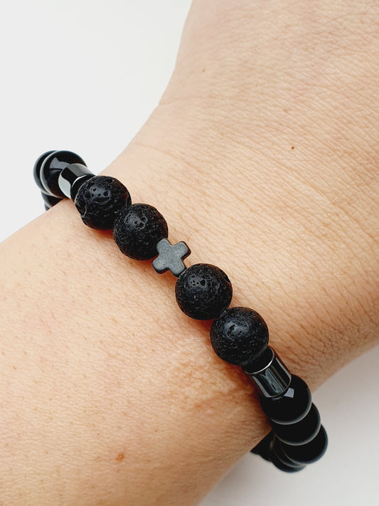 Obsidian And Lava Natural Stone Bracelet 8mm Beaded, Hematite Cross, Gift Box Jewellery