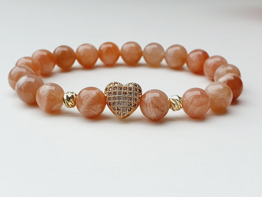 Sunstone Bracelet Natural Stone 8mm Beaded, Gold Plated Heart, Gift Box Jewellery